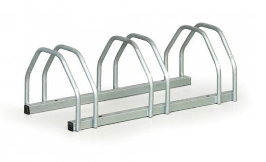 Stojan pre 3 bicykle. Patentovaný tvar držiakov kolies - bicykle po zasunutí do stojanu drží za pneumatiku, sú stabilné, nepoškodzujú sa špice a ráfiky bicyklov. Vyrobený z rúrok s Ø 18 mm a štvorcového profilu 30 x 30 mm. Povrchová úprava stojanu galvanický pozinok - zaručuje vynikajúcu ochranu proti korózii. Stojan vybavený dvoma otvormi pre ukotvenie k zemi alebo na stenu.