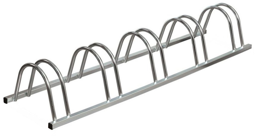 Stojan pre 5 bicyklov. Patentovaný tvar držiakov kolies - bicykle po zasunutí do stojanu drží za pneumatiku, sú stabilné, nepoškodzujú sa špice a ráfiky bicyklov. Vyrobený z rúrok s Ø 18 mm a štvorcového profilu 30 x 30 mm. Povrchová úprava stojanu galvanický pozinok - zaručuje vynikajúcu ochranu proti korózii. Stojan vybavený dvoma otvormi pre ukotvenie k zemi alebo na stenu.