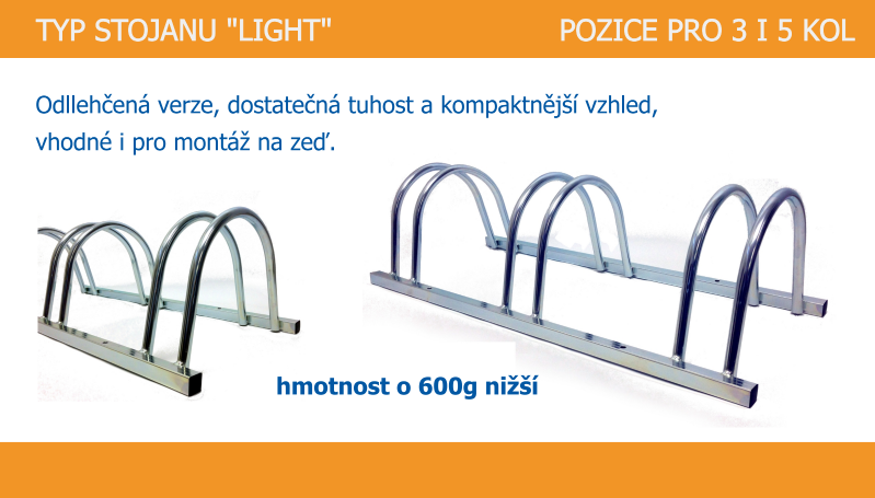 Klasický známy stojan pre 5 bicyklov. Vhodný pre všetky typy bicyklov so všetkými štandardnými rozmermi plášťov. Nosné časti stojanu vyrobené z oceľových profilov. Bicykel je možné uzamknúť cez rám. Rozmery: šírka 1000 mm, výška 760 mm, hĺbka 630 mm, hmotnosť 9 kg, šírka státie 175 mm. Záruka 2 roky.