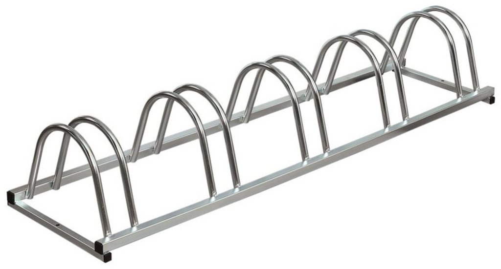 Klasický známy stojan pre 5 bicyklov. Vhodný pre všetky typy bicyklov so všetkými štandardnými rozmermi plášťov. Nosné časti stojanu vyrobené z oceľových profilov. Bicykel je možné uzamknúť cez rám. Rozmery: šírka 1000 mm, výška 760 mm, hĺbka 630 mm, hmotnosť 9 kg, šírka státie 175 mm. Záruka 2 roky.