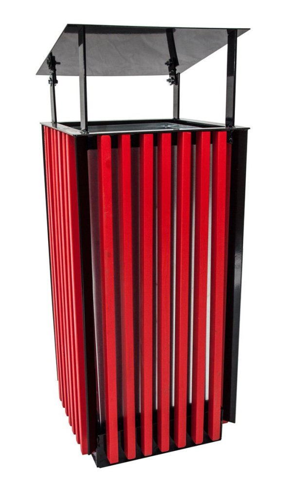 Drevený odpadkový kôš so strieškou. Povrchová úprava vypaľovaná farba alebo žiarový zinok. Drevo ošetrené 3x lazúrou. Kôš vybavený vyberateľnou pozinkovanou vložkou. Výška 1000 mm, šírka 400 mm, hĺbka 400 mm, objem 65 l, hmotnosť 35 kg.
