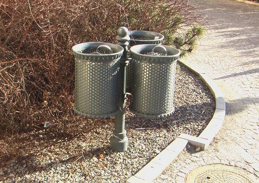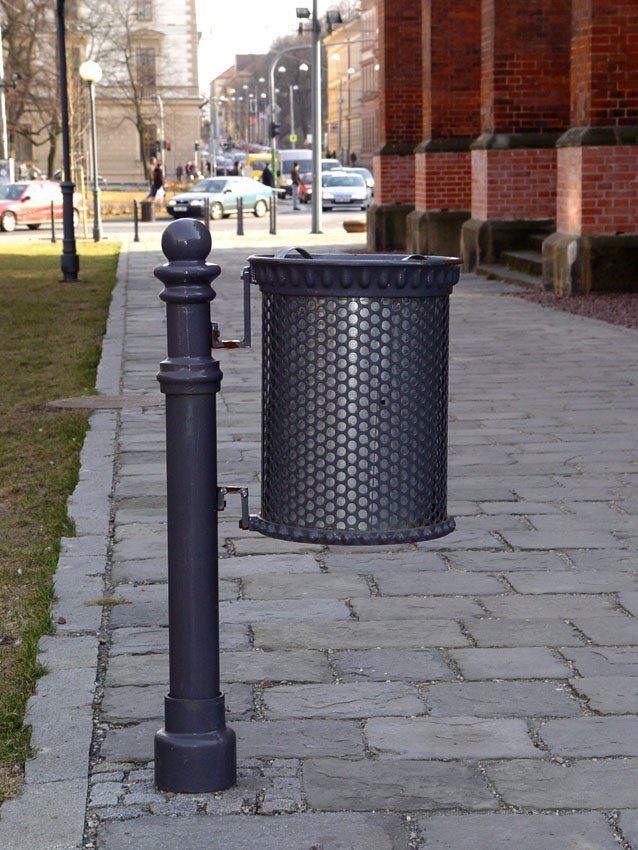 Odpadkový kôš do vonkajších priestorov. Vyrobený z masívnych liatinových odliatkov s oceľovou stojinou. Odpadová nádoba je z oceľového pozinkovaného plechu. Na pripevnenie do zeme. Výška 1100 mm, objem 60 l, váha 70 kg. Záruka 2 roky.