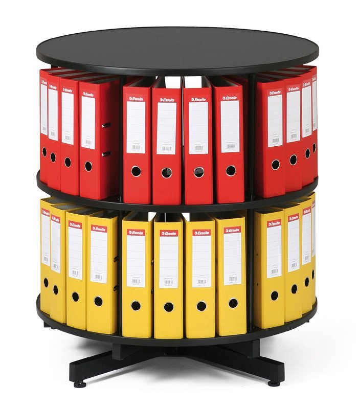 Otočná archivačná skriňa - karusel. Výška 890 mm, priemer 800 mm, 2 podlažia, kapacita krúžkových poriadačov 48. Prevedenie celý popis a parametre
