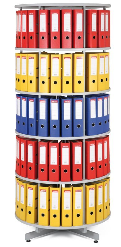 Otočná archivačná skriňa - karusel. Výška 2000 mm, priemer 800 mm, 5 podlaží, kapacita krúžkových poriadačov 120. Prevedenie svetlosivá.