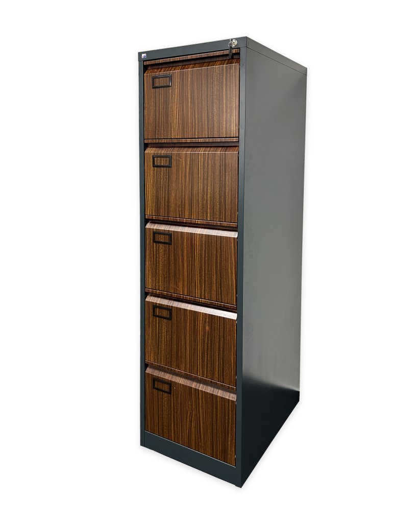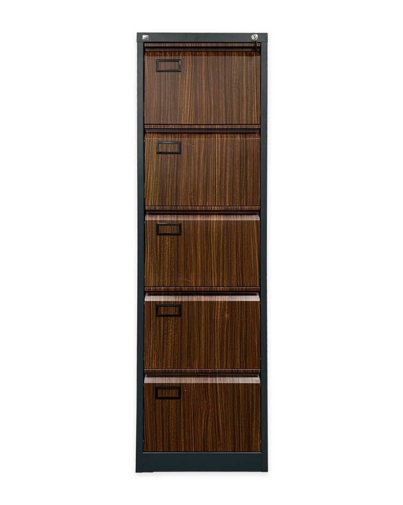 Päťzásuvková demontovaná kartotéka z oceľového plechu hrúbky 0,6 mm. Výška 1620 x šírka 460 x hĺbka 620 mm, centrálny zámok, plný výsuv. Pre dokumenty alebo závesné dosky formátu A4. Farba biela RAL 9003/imitácia svetlé drevo.