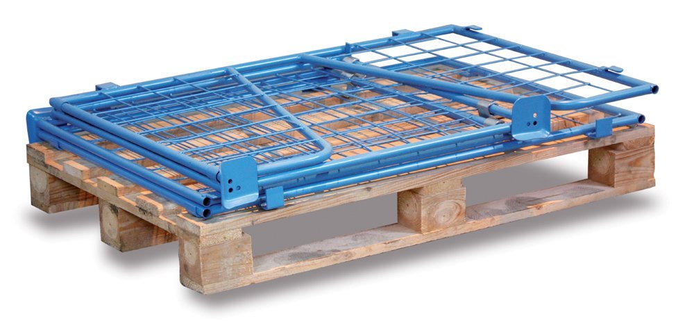 Konštrukcia zo zváraných oceľových rúr. Povrchová úprava lakovaná prášková farba RAL 5010 modrá. Výplne stien z drôtenej mriežky 100 × 100 mm. Jedna dlhšia strana s výrezom. Pri upevnení na EUR-paletu vznikne skladovací priestor pre ukladanie. Výška hradenia 1600 mm, pre palety o veľkosti 1200 x 800 mm. Stohovateľnosť - 3 kusy, nosnosť 750 kg. Paleta nie je súčasťou dodávky.