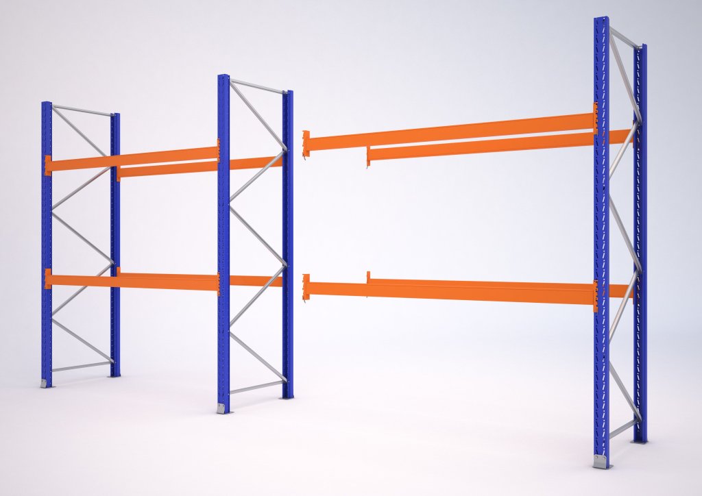 Paletový regál prístavný. Nosnosť 900 kg na 1 paletu, výška 4626 mm, šírka 2700, hĺbka 1100 mm, počet úrovní nosníkov 2. Lakované stojny vo farbe modrá RAL 5010, nosníky farba oranžová RAL 2004. Iba jedna stojina - slúži k nastavovaniu základnych regálov.
