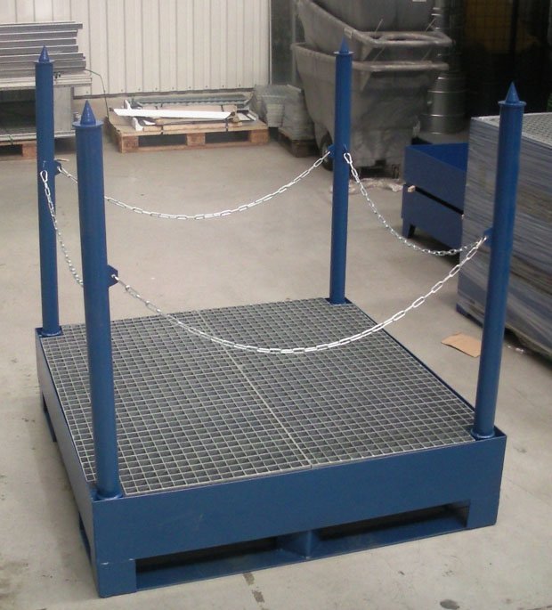 Palety slúžia pre bezpečné skladovanie a transport kvapalín, ktoré škodia životnému prostrediu. Vhodné len do budov alebo pod prístrešok. Povrchová úprava: lakovaná farba RAL 5010. Rozmery v. 1300 x š. 1200 x hl. 1200 mm. Záruka 2 roky.