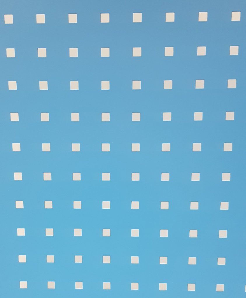 Perfopanel, ideálny na zavesenie náradia a na rýchly prístup k spojovaciemu materiálu. Rozmery 2000 x 1000 mm, hrúbka 1,4 mm, štvorcové otvory 10 x 10 mm, rozstup otvorov 38 x 38 mm, farba modrá RAL 5012 polomat.