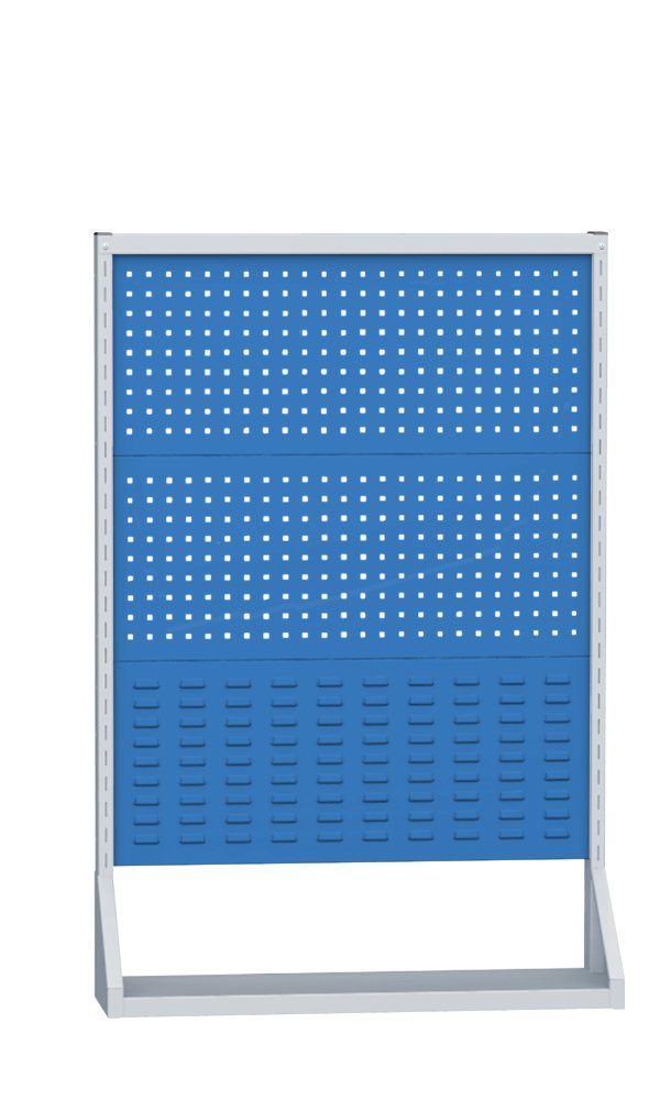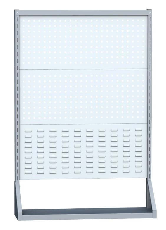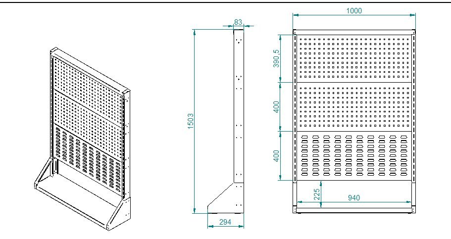Pevný jednostranný perfostojan pre 3 panely. Slúži pre zavesenie náradia a boxov. Možnosť dokúpenia políc. Obrázok iba ilustratívny. Druh panelov podľa špecifikácie zákazníka (možno objednať ako je na obrázku, alebo dva rovnaké panely). Celkové rozmery stojanu v mm (V x Š x H) 1503 x 1000 x 294. Podrobnejšie rozmery nájdete na perokresbe v galérii.