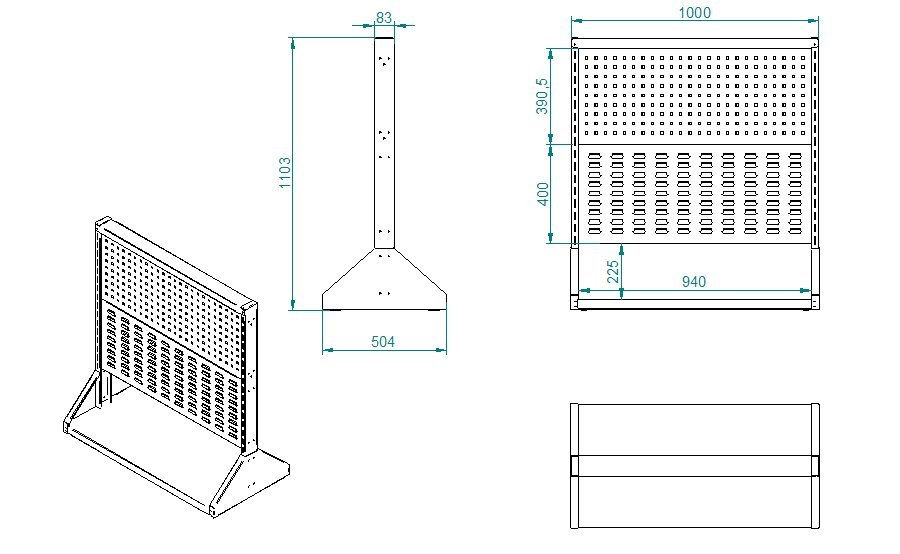 Pevný obojstranný perfostojan pre 4 panely. Slúži pre zavesenie náradia a plastových boxov. Celkové rozmery stojanu v mm (V x Š x H) 1103 x 1000 x 504.
