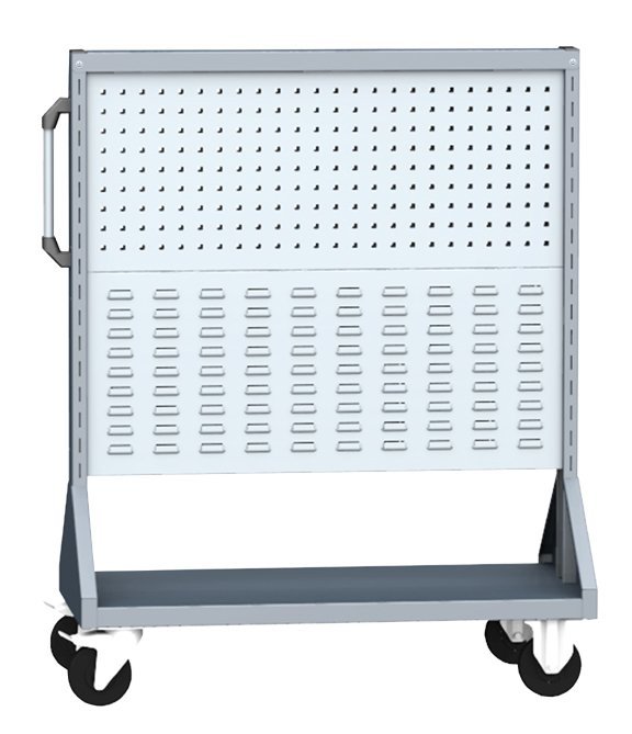 Pojazdný obojstranný perfostojan pre 4 panely. Slúži pre zavesenie náradia a plastových boxov. Celkové rozmery stojanu v mm (V x Š x H) 1257 x 1055 x 504.