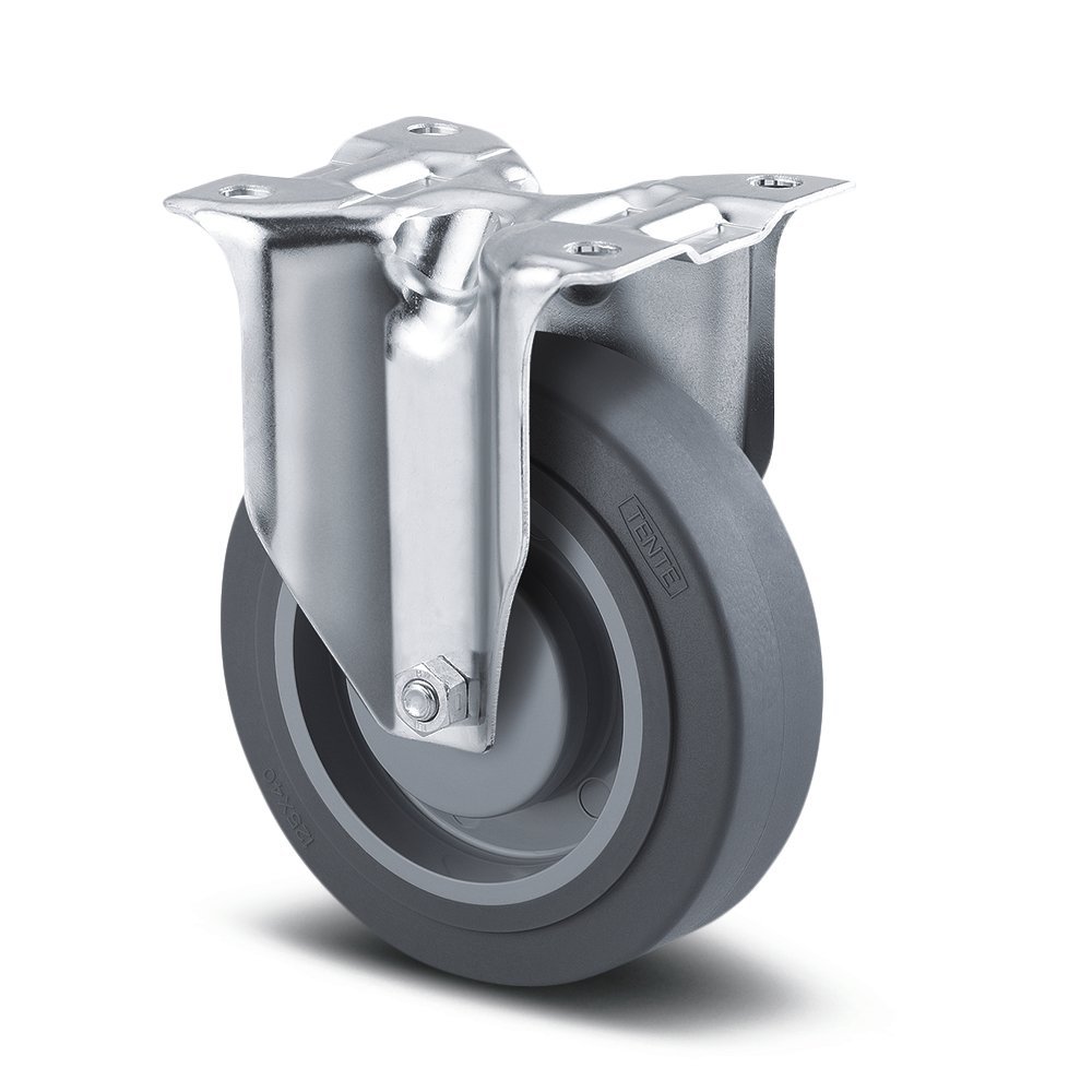 Pevné prístrojovej koleso s ø 125 mm, teleso vyrobené z lisovanej ocele, pozinkovano, dvojradová guľôčková dráha v otočnej hlave, koliesko zaistená skrutkou a maticou, protiprašná ochrana, upínacia platnička. Stred kolesa vyrobený z polypropylénu, behúň z TENTEprenu sivej farby (termoplastická guma), presné guličkové ložisko.