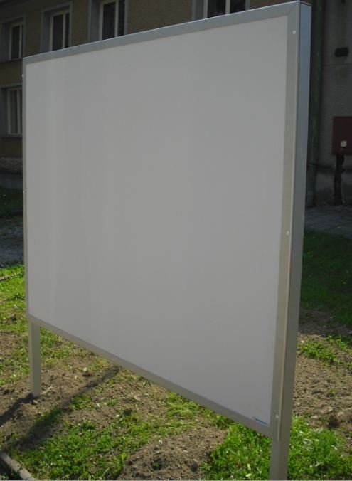 Polepovací plagátovacie tabule sa skladá z dvoch plôch, ktoré tvoria eloxovaný hliníkový rám a PVC doska s hrúbkou 8 mm. Medzi jednotlivými plochami sú umiestnené stĺpy. Rozmery v. 1000 x š. 1250 mm. Cena vrátane strieborných eloxovaných stĺpov.