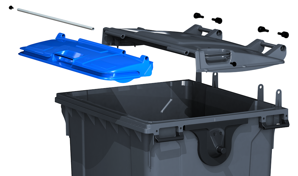 Kontajnér je vhodný pre zber komunálneho a priemyselného odpadu. V čiernej farbe, malé veko v rôznych farbách. Dodáva sa s dvomi brzdenými kolieskami. Rozmerom zodpovedajú DIN 30 700 a UNI 9260.