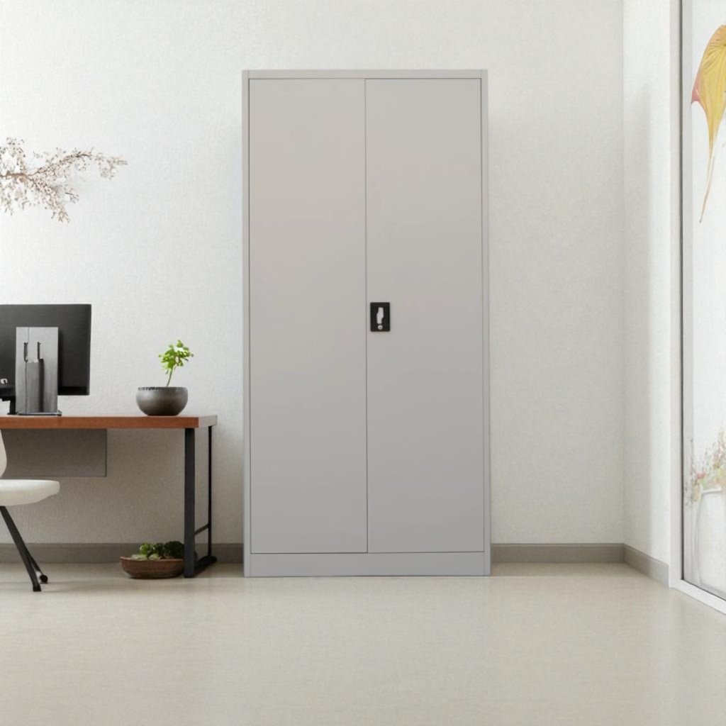 Dvojdverová kovová skriňa na šanóny, 2x polica, výška 1000, šírka 800, hĺbka 383 mm, uzamykateľná. Farba šedá RAL 7035.
