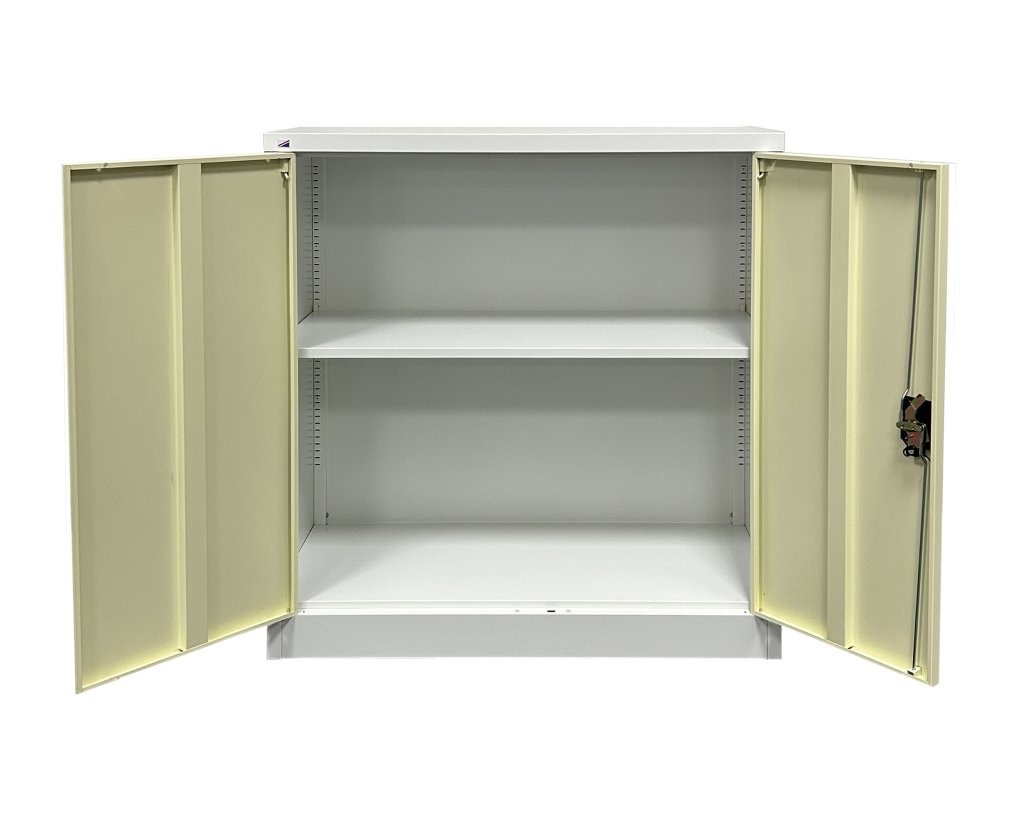 Dvojdverová DEMONTOVANÁ skriňa z oceľového plechu hrúbky 0,6 mm. Výška 1000 x šírka 900 x hĺbka 400 mm, 1x polica, cylindrický rozvorový zámok s dvoma kľúčmi. Povrchová úprava práškovou farbou.