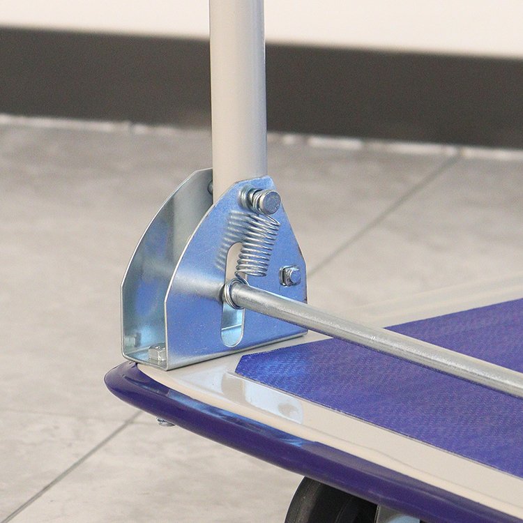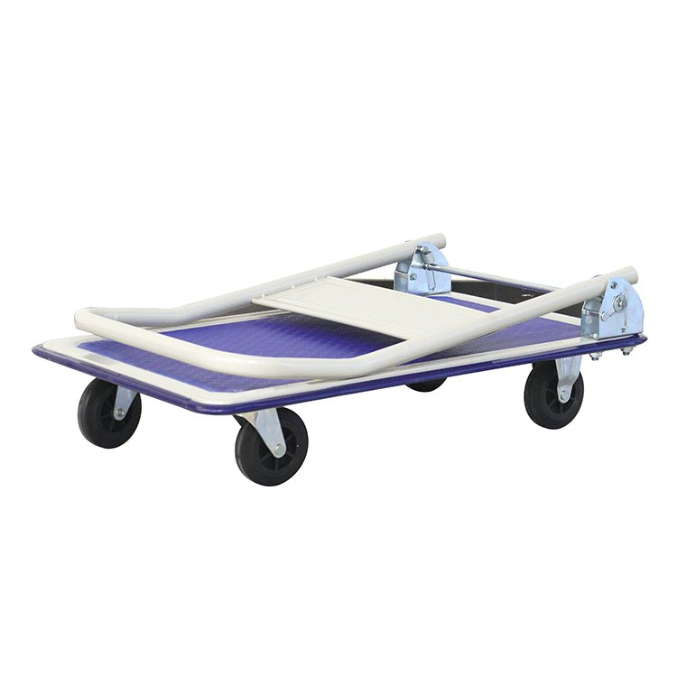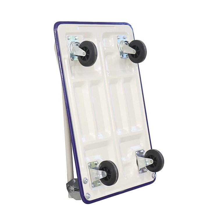 Plošinový vozík so sklápacou rukoväťou nemeckej výroby, jednoposchodový. Oceľová konštrukcia, drevená ložná plocha. 4 špeciálne pneumatické kolieska Fetra TPE, z toho 2 otočné s brzdou, 2 pevné. Farba modrá RAL 5007.