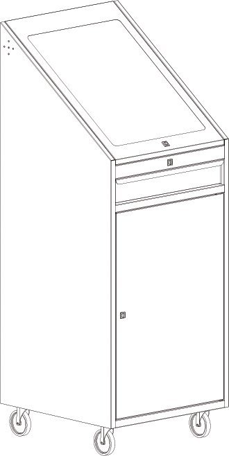 Počítačová skriňa vyrobená z 0,8 mm hrubého oceľového plechu. Vybavená zásuvkou na klávesnicu a posuvnou policou v spodnej priehradke. Na bočných stenách ventilácie, na zadnej strane otvory pre napájanie. Šikmá obrazovka vyrobená z tvrdeného skla. Rozmery v mm (V x Š x H) 1545 x 640 x 635. Bez elektrického vybavenia. Skriňa je vybavená elektrickým ventilátorom a napájací lištou s odrušením 230V.