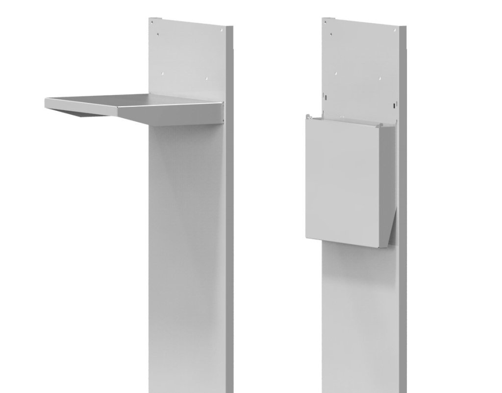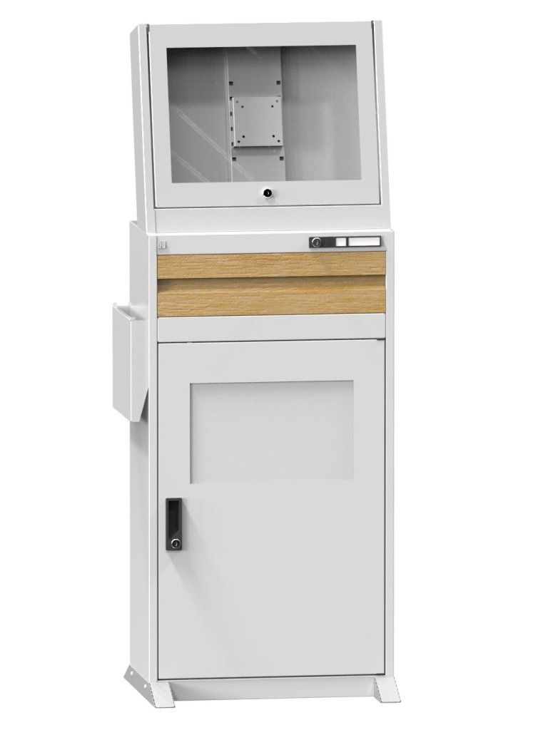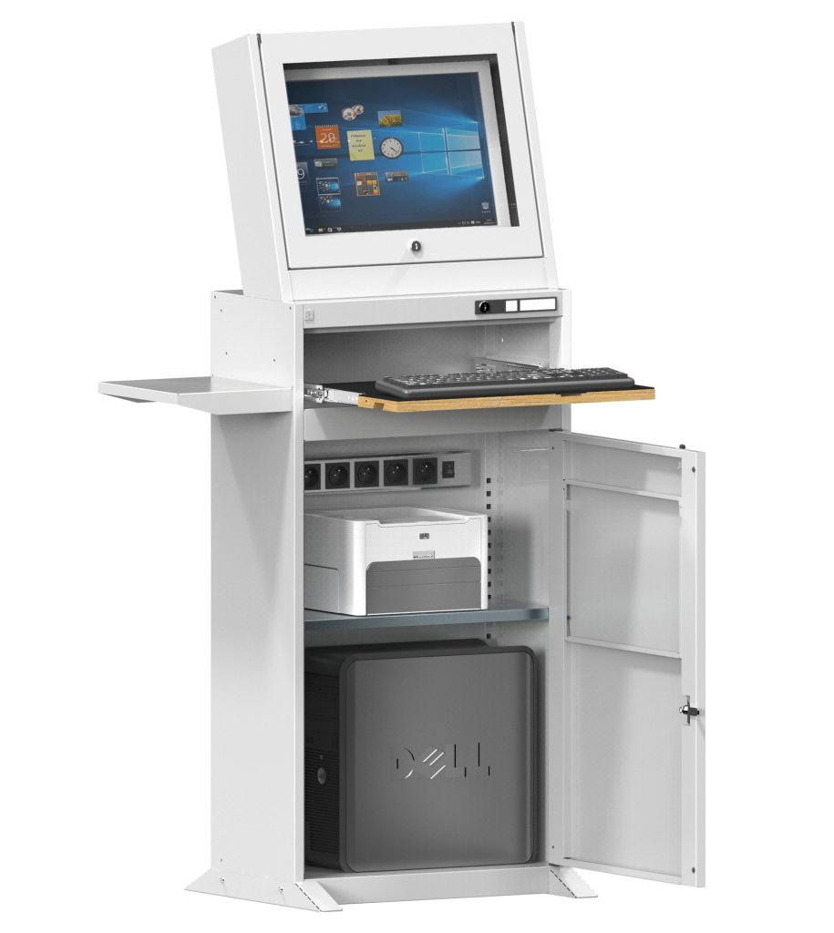 Počítačový terminál TPC1 s elektrickými zásuvkami. Výklopné dvierka s tvrdeným sklom a posuvným držiakom pre monitor, drevená zásuvka so sklopným čelom pre klávesnicu, dvojitá dvierka pre ľahký prístup k tlačiarni, sklopná bočná polica. Celkové rozmery - výška 1666 x šírka 660 x hĺbka 531 mm.