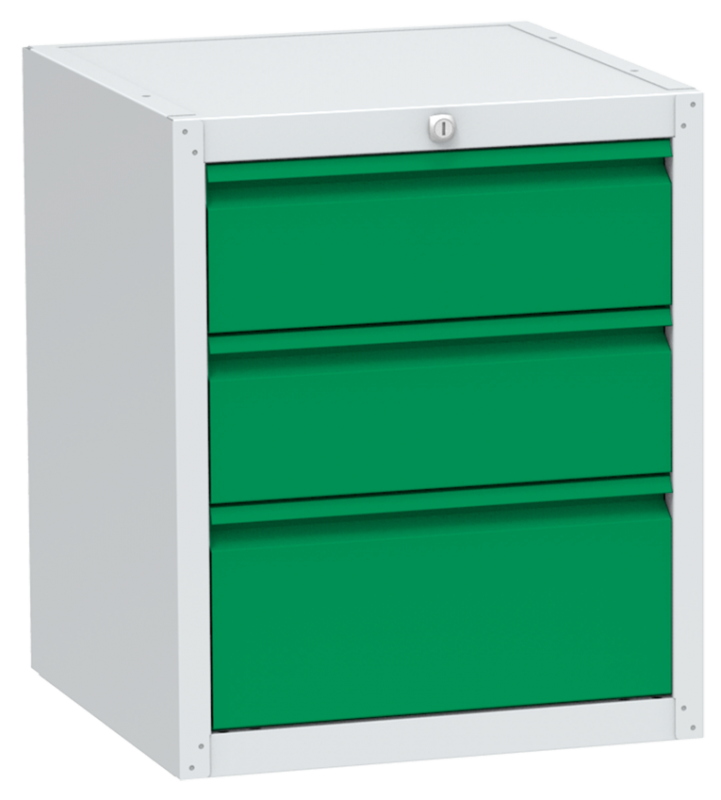 Podvesná zásuvka pracovného stolu, šírka 500, výška 600, hĺbka 500 mm. 3x zásuvka (2x 150,5, 1x202 mm). Farba korpusu RAL 7035 svetlosivá.