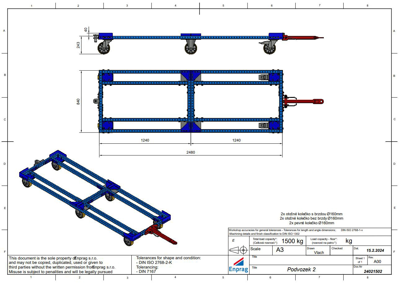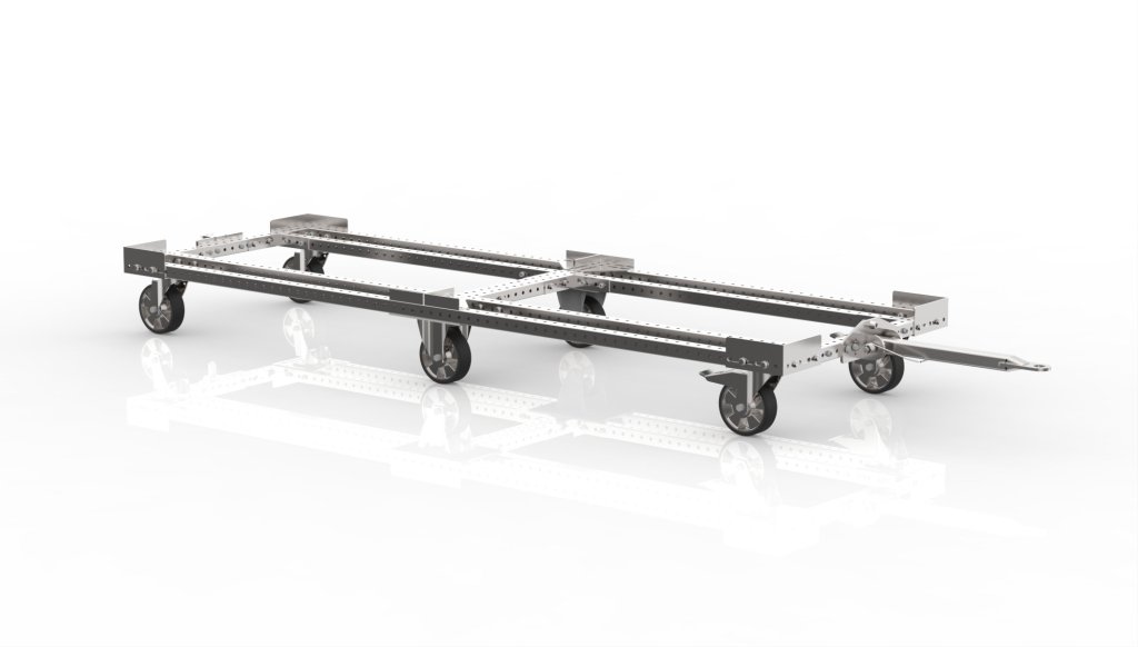 Manipulačný podvozok vyrobený z montovaných jaklov o rozmere 40x40 mm vhodný pre rôzne manipulačné účely v skladoch aj dielňach. Vďaka svojej vysokej nosnosti 1500 kg je ideálny na prepravu ťažších predmetov. Súčasťou podvozku je 2x otočné koliesko s brzdou, 2x otočné koliesko bez brzdy a 2x pevné koliesko s priemerom 160 mm, ktoré umožňujú jednoduchú manipuláciu s predmetmi. Podvozok je dostupný v niekoľkých variantoch - pozinkovaný povrch alebo farebný lak. Rozmery 308 x 836 x 2476 mm.