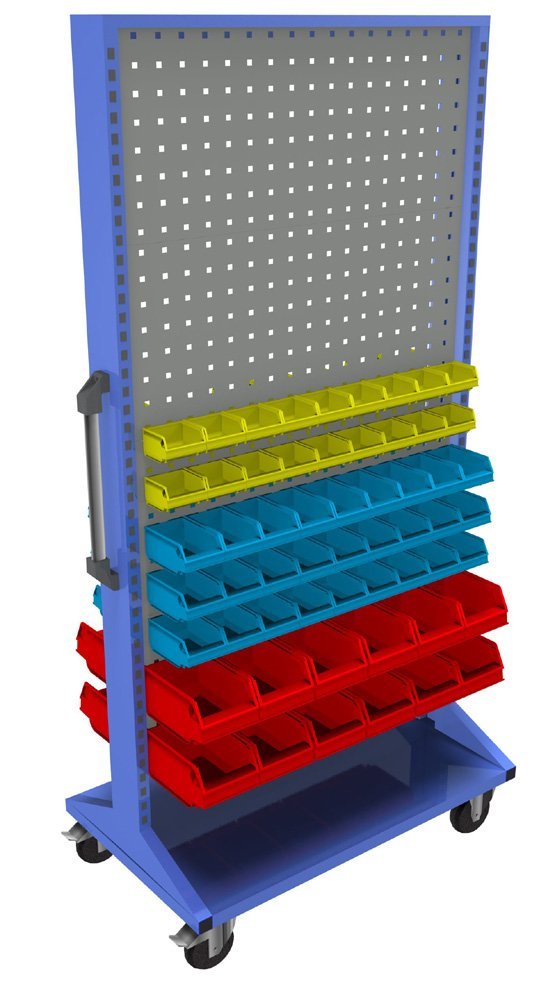 Pojazdný obojstranný panel s vybavením. Konštrukcia stojanu je tvorená robustným rámom s kovovými perforanými stenami pre zavesenie plastových boxov a držiakov náradia. Rám je lakovaný odolnou práškovou farbou, perforované panely sú pozinkované alebo lakované odolnou práškovou farbou. Panely vybaveny vodiacim madlom a štyrmi kolieskami (2x pevné, 2x otočné s brzdou).