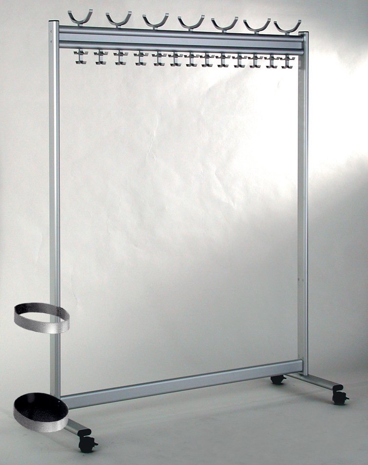 Hliníkový vešiak na kolieskach. 10 háčikov na klobúky, 32 háčikov na kabáty. Rozmery v mm (V x Š x H) 1700 x 1000 x 400. Držiak na dáždniky nie je v cene, môžete si ho za príplatok dokúpiť.