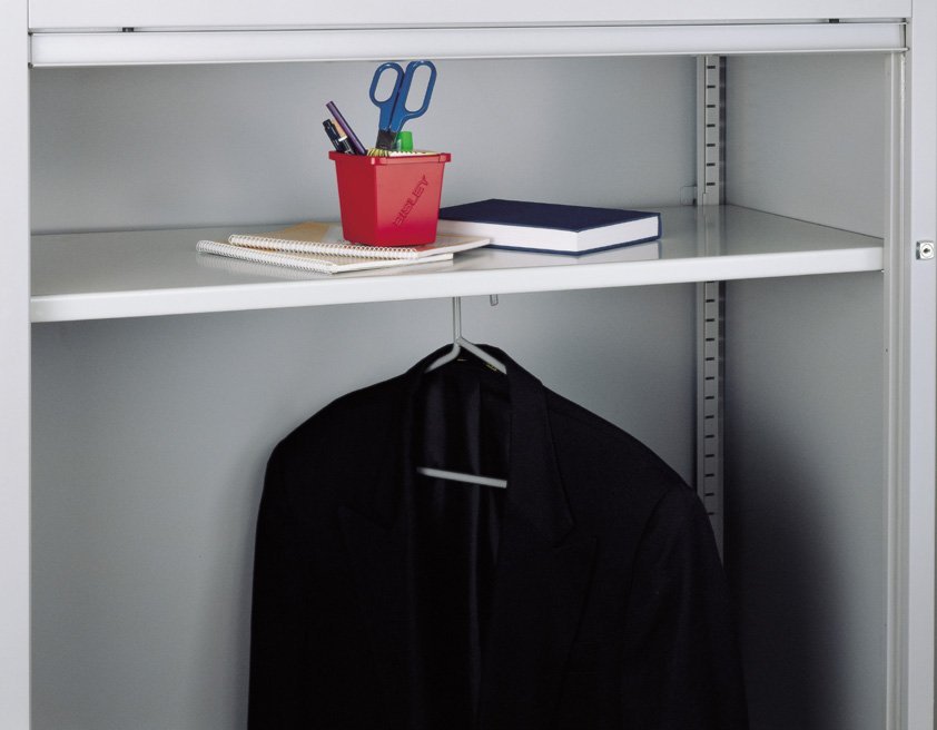 Polica s tyčou na odevy. Vhodná iba do roletových skríň Bisley Essentials typ YETB10XX (šírka 1000 mm), dvojdverových skríň Bisley Essentials typ YECB09XX (šírka 914 mm) a demontovaných dvojdverových skríň typ KC.