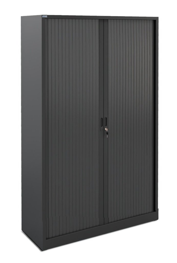 Kovová skriňa s horizontálnou roletou s 4 policami. Nosnosť police 50 kg. Farba korpusu a rolety antracit RAL 7016. Výška 1950 x šírka 1000 x hĺbka 450 mm.