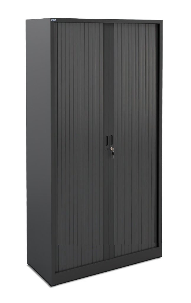 Kovová skriňa s horizontálnou roletou s 4 policami. Nosnosť police 50 kg. Farba korpusu a rolety antracit RAL 7016. Výška 1950 x šírka 1000 x hĺbka 450 mm.