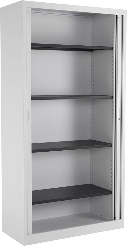 Kovová skriňa s horizontálnou roletou s 4 policami. Nosnosť police 40 kg. Rôzne farby na výber. Výška 1990 x šírka 1000 x hĺbka 435 mm.