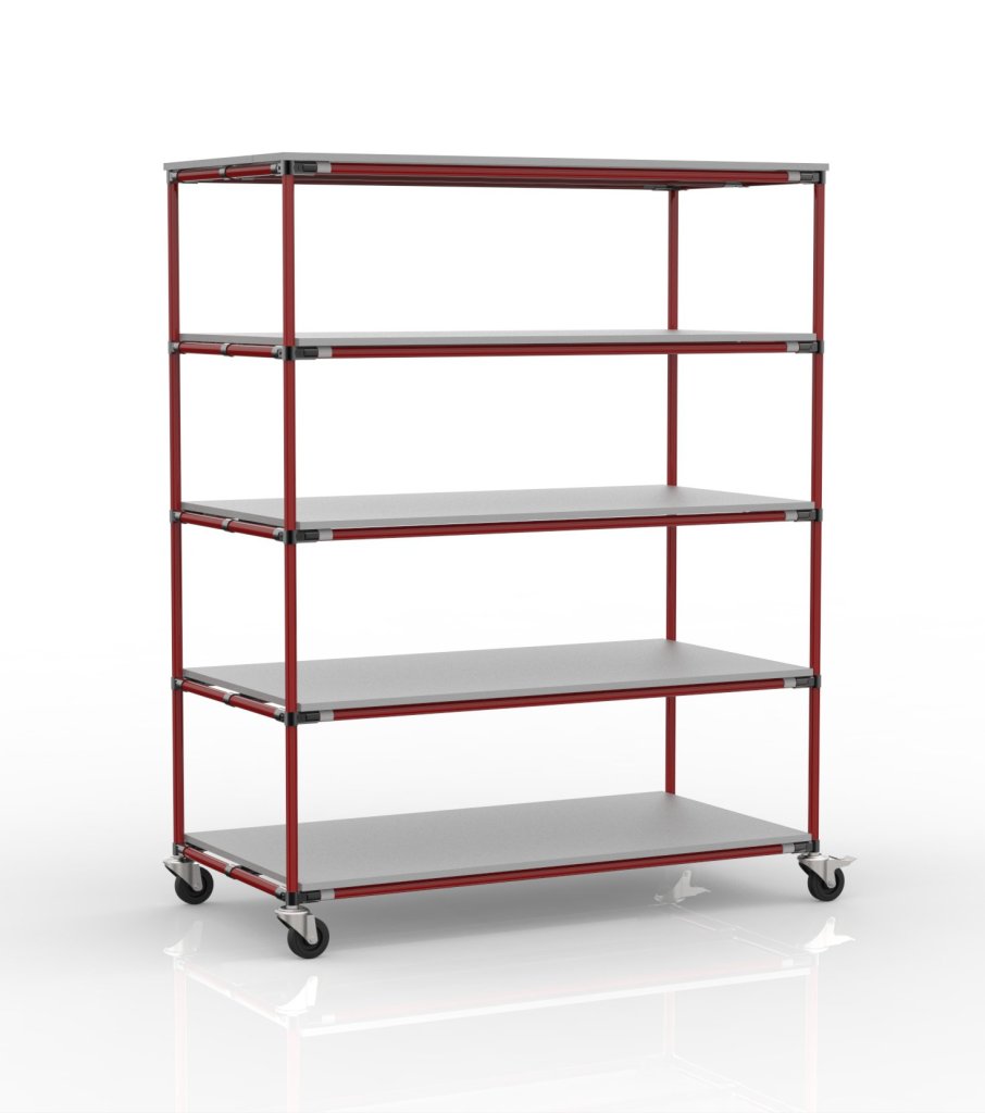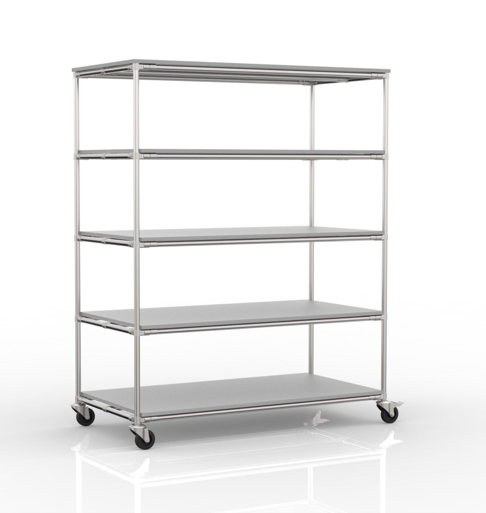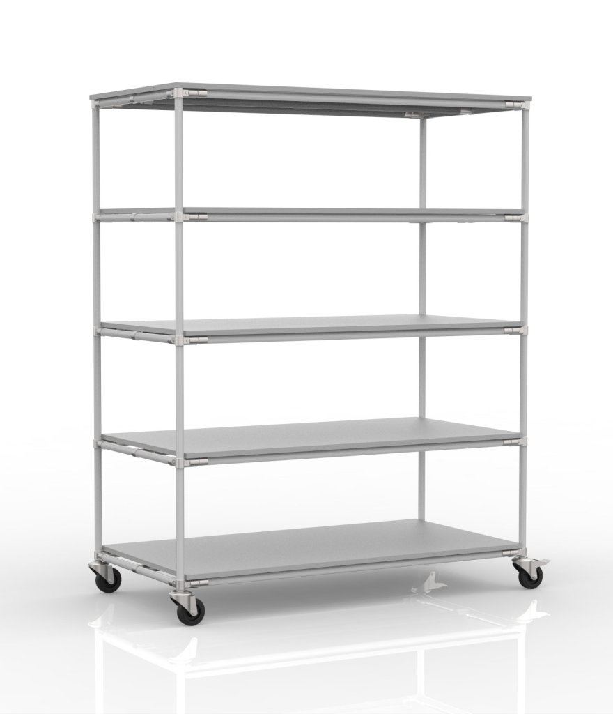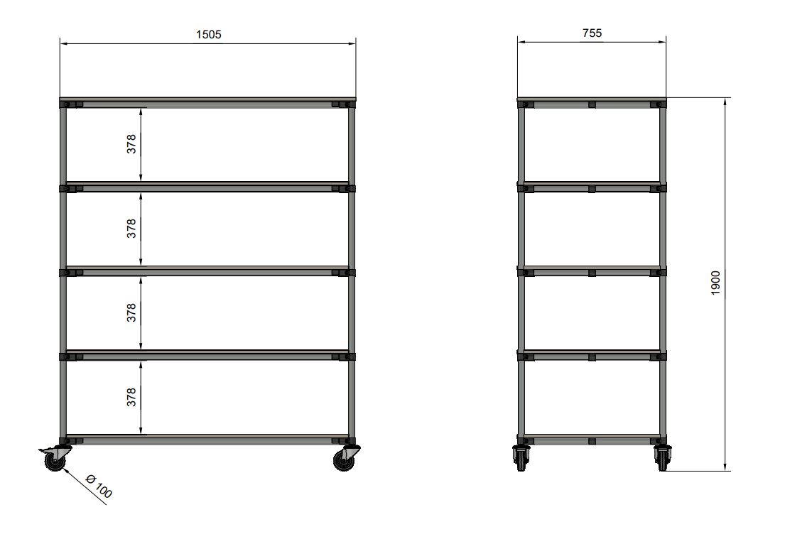 Policový regál s piatimi rovnými policami je praktickým pomocníkom pre manipuláciu vo výrobných firmách a logistických centrách, najmä v oblasti e-commerce. Súčasťou vozíka sú štyri otočné kolieska s priemerom 100 mm. Prednosťou týchto koliesok je nízky valivý odpor a vďaka tomu komfortná manipulácia. Konfiguráciu koliesok je možné zmeniť podľa požiadaviek zákazníka. Celková nosnosť 300 kg, nosnosť na polici 75 kg. Rozmery 1900 x 1505 x 755 mm.