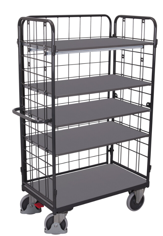Policový vozík nemeckej výroby, oceľová konštrukcia, drôtené bočnice s veľkosťou ôk 100 x 100 x 5 mm. Stabilné police z tvrdého materiálu na báze dreva. Stavebnicový systém, ktorý možno kedykoľvek prestavať alebo doplniť. Jedna polica pevná a tri odstrániteľné, nosnosť jednej police 90 kg. 4 špeciálne pneumatické kolieska Fetra TPE, z toho 2 otočné s brzdou, 2 pevné.