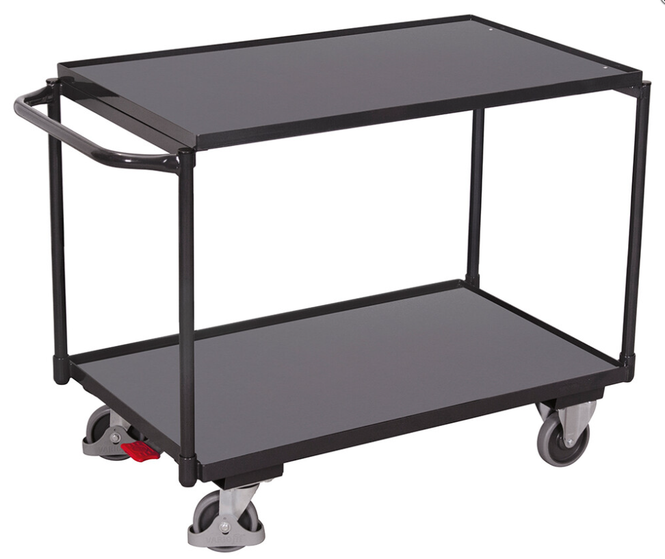 Oceľová konštrukcia, drevená ložná plocha - tmavo šedá. Povrchová úprava práškovým lakom RAL 7016 antracit, odolná voči nárazu a poškriabaniu. Vysoko odolná termoplastická kolieska s guličkovým ložiskom, 2 otočné s centrálnou brzdou Easy Stop, 2 pevné. Rozmer výška 850 x šírka 1025 x hĺbka 525 mm. Výška okraja 12 mm. 2 police. Nosnosť 250 kg.