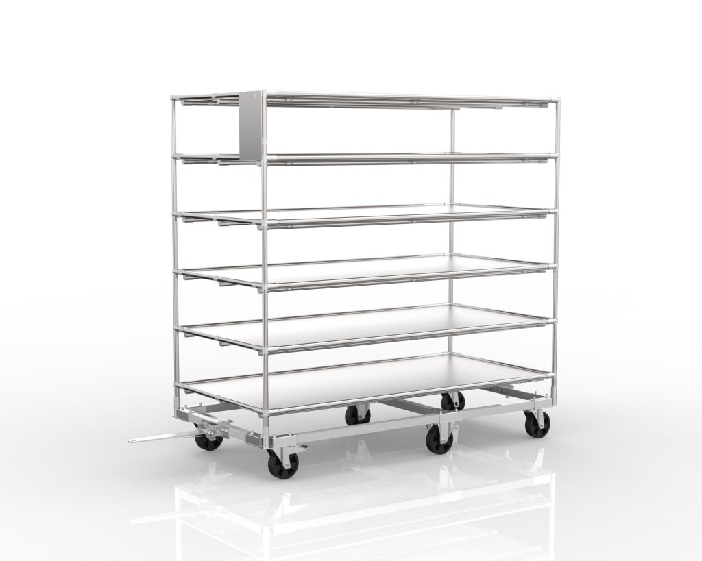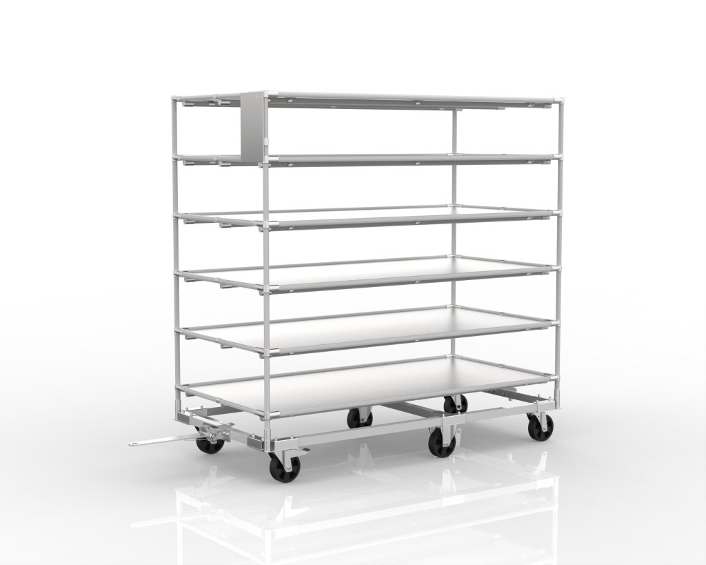 Policový vozík z jaklového podvozku s nadstavbou z rúrkového systému. Možnosť zapojenia viacerých vozíkov do vláčika. Vhodný na prepravu materiálu a produktov.