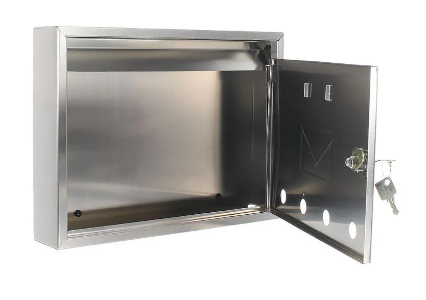 Kvalitná poštová schránka za vynikajúcu cenu, horný vhod pod vekom (rozmer 300 x 30 mm) + tubus pre tlač. Výška 380 x šrřka 370 x hĺbka 120 mm. Čierny korpus, nerezové dvierka, 2x kľúč.