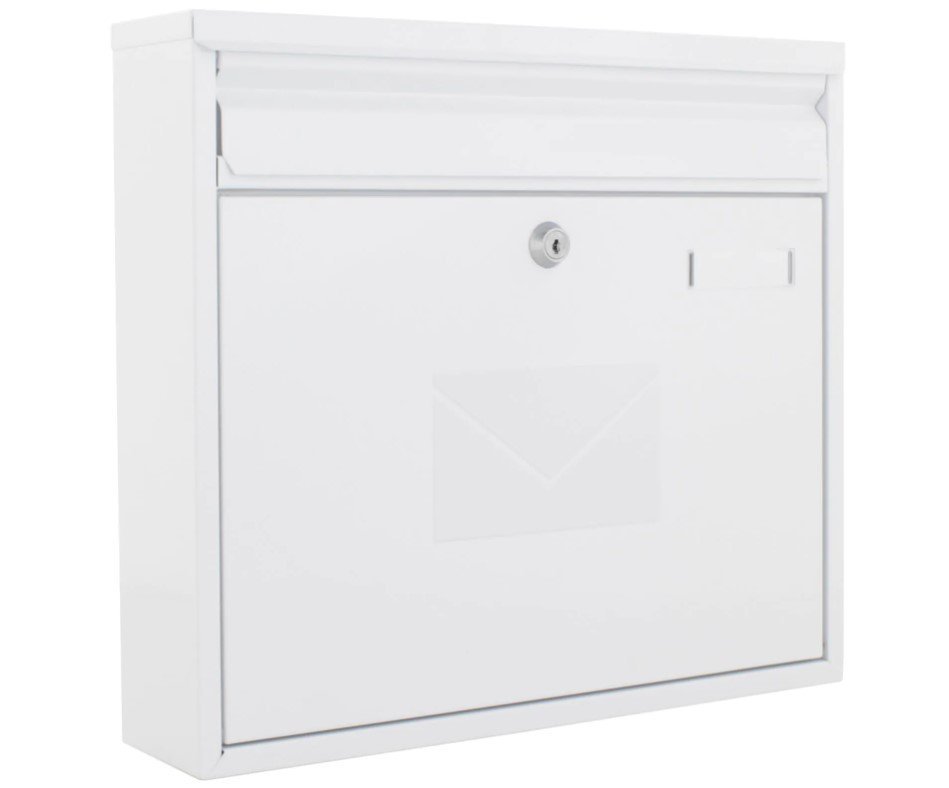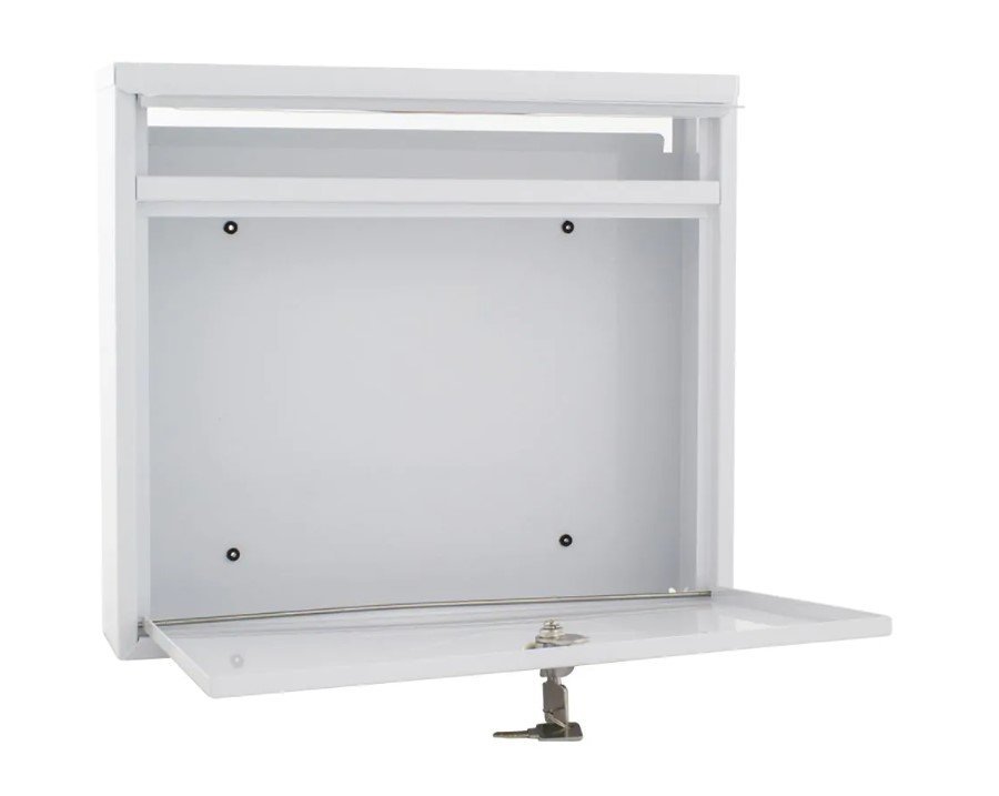 Veľká poštová schránka pre vnútorne použitie v bielej farbe, predný vhoz. Výška 320 x šírka 360 x hĺbka 85 mm.