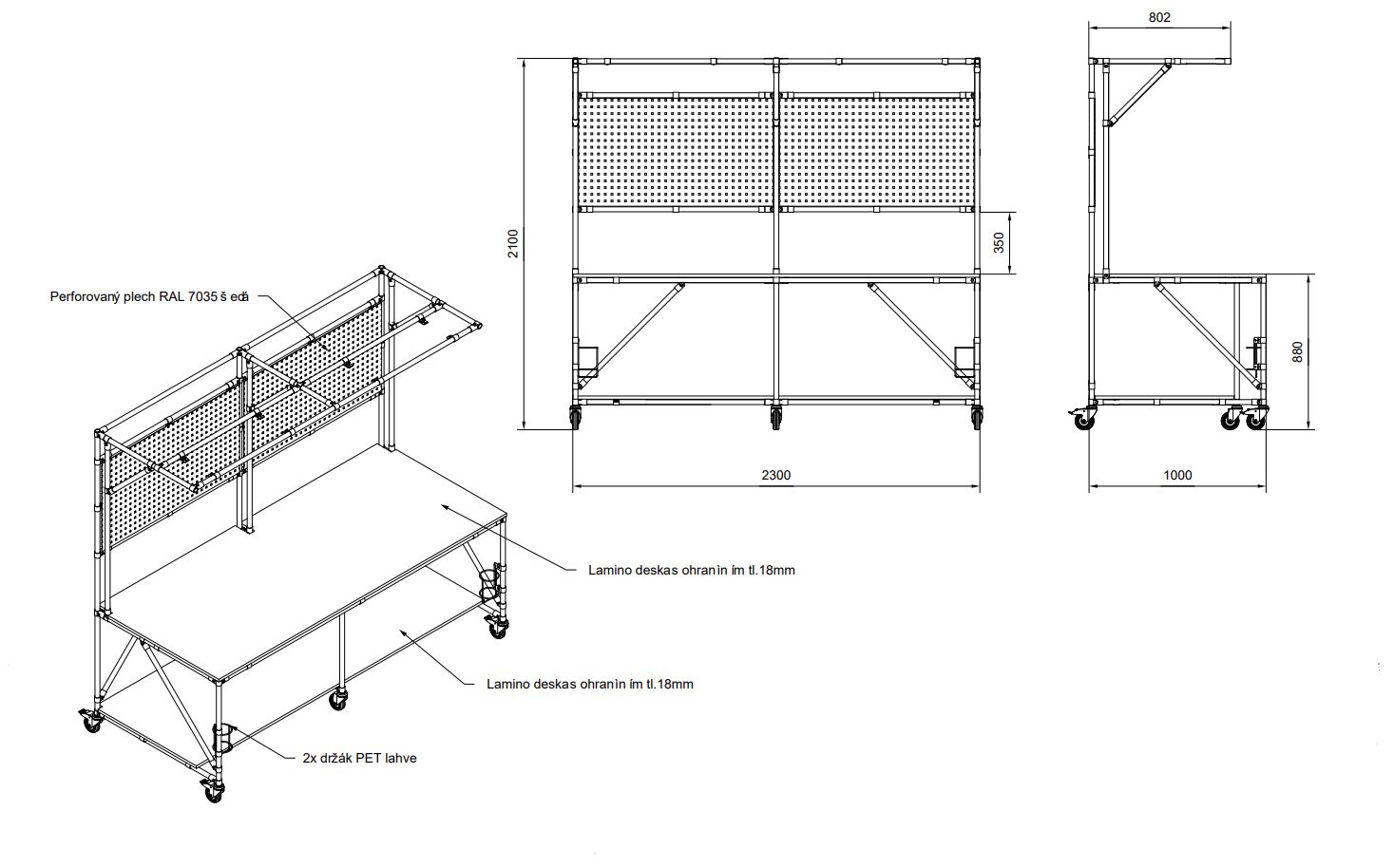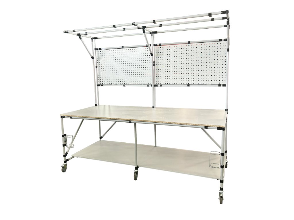 Pracovný stôl na kolieskach je praktické riešenie mobilného pracovného miesta. Súčasťou konštrukcie stola je perfopanel farby RAL 7035, lamino doska hrúbky 18 mm a 2x praktický držiak PET fľaše. Stôl poskytuje dostatok priestoru a pohodlia pre efektívnu prácu v dielni. Výška pracovnej plochy 800 mm. Celková nosnosť 200 kg, nosnosť na poschodí 100 kg. Rozmery stola 2100 x 2300 x 1000 mm.