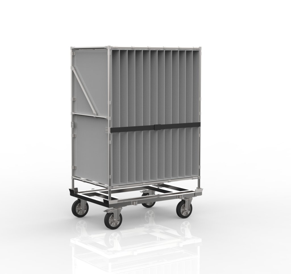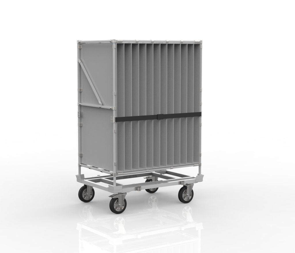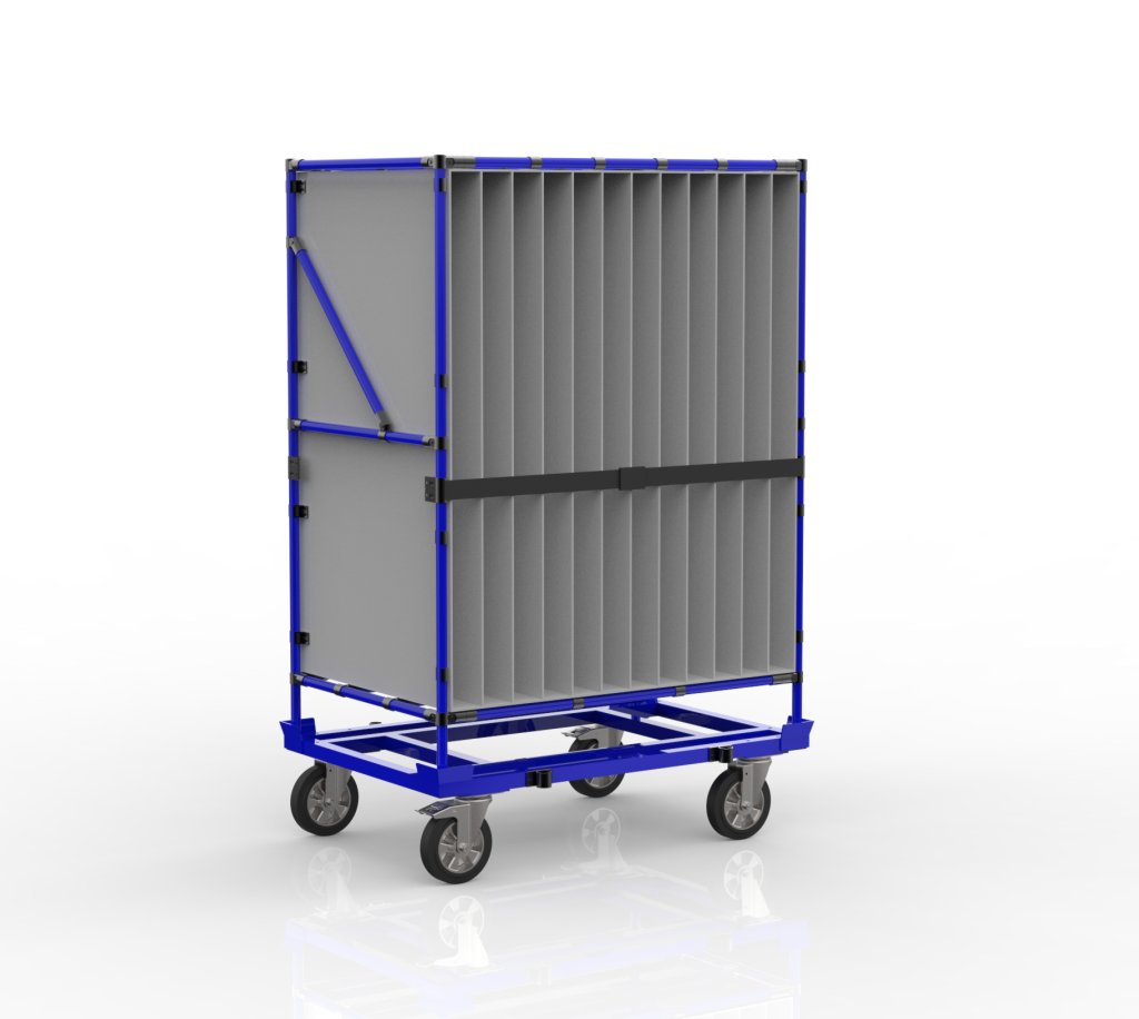 Zváraný vozík s nadstavbou z rúrkového systému a dvoma policami. Základ vozíka tvorí zváraný oceľový rám s pozinkovaným povrchom, nadstavba je z rúrkového stavebnicového systému s laminovanou PP vložkou s vyberateľným dnom v každej priehradke. Na bezpečné uloženie materiálu slúžia upínacie pásy s okami na každej strane. Súčasťou sú aj dve otočné kolieska s brzdou a dve otočné kolieska bez brzdy s priemerom 200 mm. Nosnosť vozíka je 240 kg. Nosnosť police je 120 kg. Rozmery: 1883 x 1203 x 803 mm.