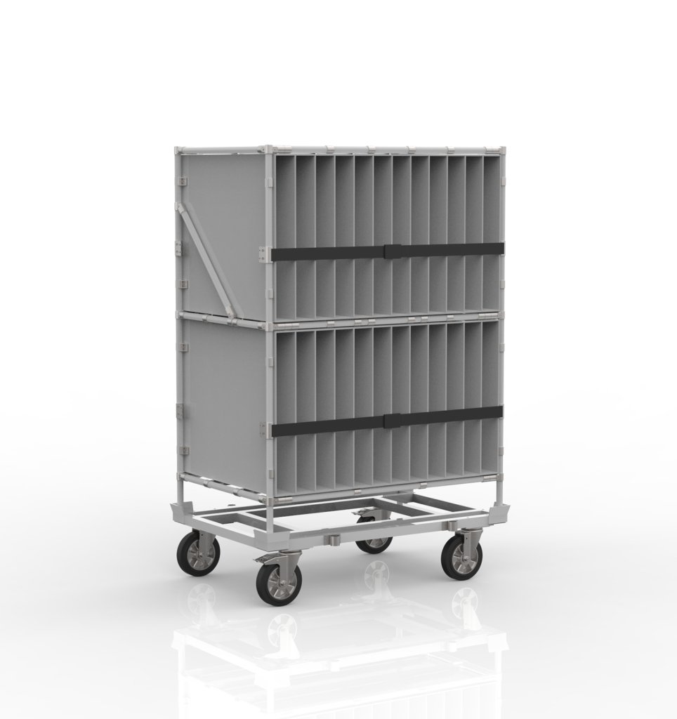 Zváraný vozík s nadstavbou z rúrkového systému. Základ vozíka tvorí zváraný oceľový rám s pozinkovaným povrchom, nadstavba je z rúrkového stavebnicového systému s laminovanou PP vložkou s vyberateľným dnom v každej priehradke, na bezpečné uloženie materiálu slúži upínací pás s okami na každej strane. Súčasťou sú aj dve otočné kolieska s brzdou a dve otočné kolieska bez brzdy s priemerom 200 mm. Nosnosť vozíka je 120 kg. Rozmery 1885 x 1203 x 803 mm.
