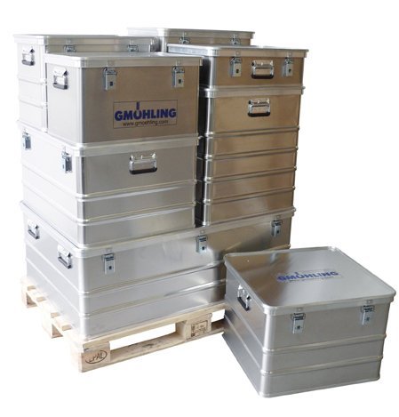 Univerzálne stohovateľné debny vyrobené z vysoko kvalitnej hliníkovej zliatiny. Odklápací vrchnák s gumovým tesnením a dvoma upevňovacími popruhmi. Dve rukoväte. Rôzne rozmery, objem 50 - 137 l.