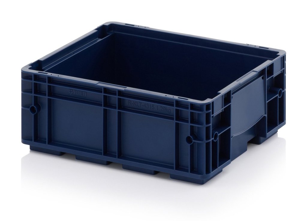 R-KLT prepravka vyrobená z kvalitného polypropylénu odolného voči olejom, tukom a väčšine kyselín a lúhov. Tepelná stálosť od -20° do 100° C, farba RAL 5003 modrá. Rrozmery v. 280 x š. 300 x hl. 400 mm. Extrémne stabilné kompozitné dno, nosnosť prepravky 20 kg, max. stohovacia nosnosť 600 kg.