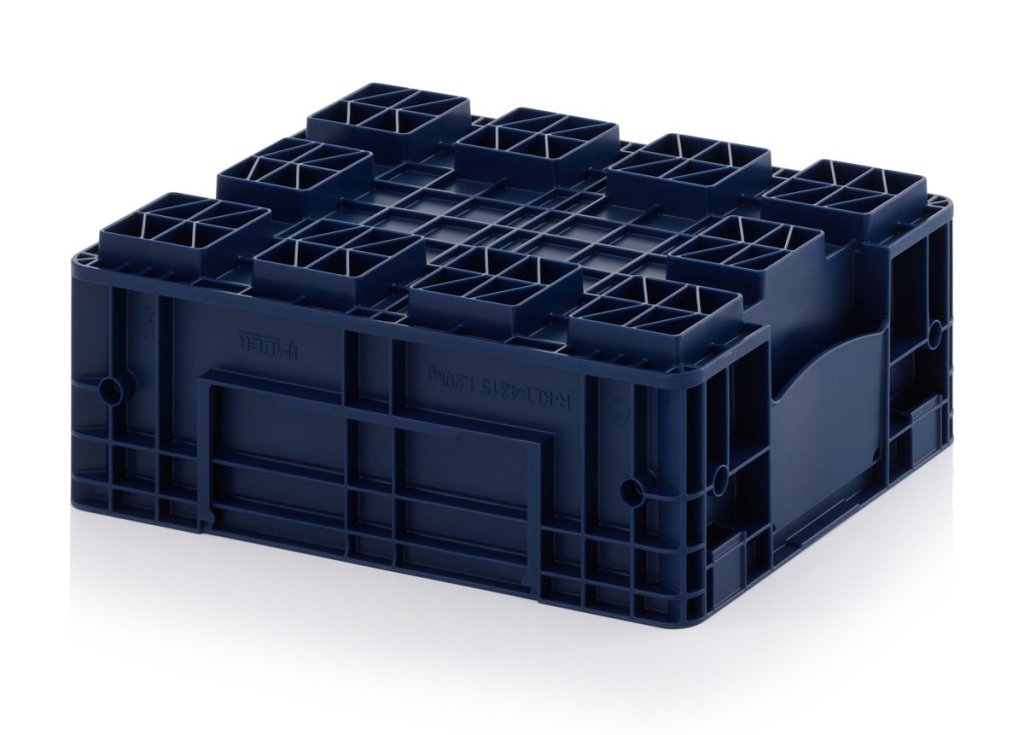 R-KLT prepravka vyrobená z kvalitného polypropylénu odolného voči olejom, tukom a väčšine kyselín a lúhov. Tepelná stálosť od -20° do 100° C, farba RAL 5003 modrá. Rrozmery v. 280 x š. 400 x hl. 600 mm. Extrémne stabilné kompozitné dno, nosnosť prepravky 20 kg, max. stohovacia nosnosť 600 kg.