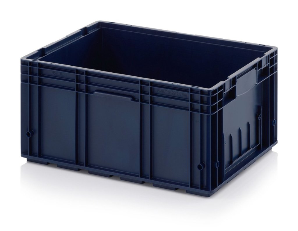 RL-KLT prepravka vyrobená z kvalitného polypropylénu odolného voči olejom, tukom a väčšine kyselín a lúhov. Tepelná stálosť od -20° do 100° C, farba RAL 5005 modrá. Rrozmery v. 280 x š. 400 x hl. 600 mm. Hladké dno s odtokovými otvormi, nosnosť prepravky 20 kg, max. stohovacia nosnosť 600 kg.