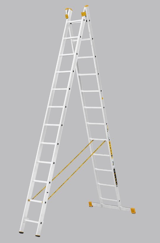 Dvojdielny univerzálny rebrík Forte, počet priečok 2x14, max. výsuvná dĺžka 7,22 m a šírka 412 mm, žltočierne koncovky. Tieto rebríky sú vyrábané tak, aby spĺňali vysokú odolnosť a spoľahlivosť pri zachovaní co možno najmenšej hmotnosti. Maximálna nosnosť 150 kg.