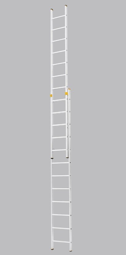 Dvojdielny výsuvný rebrík Forte, počet priečok 2x16, max. výsuvná dĺžka 8,36 m a šírka 412 mm, žltočierne koncovky. Tieto rebríky sú vyrábané tak, aby spĺňali vysokú odolnosť a spoľahlivosť pri zachovaní co možno najmenšej hmotnosti. Maximálna nosnosť 150 kg.