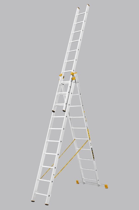 Trojdielny univerzálny rebrík Forte, počet priečok 3x14, max. výsuvná dĺžka 10,34 m a šírka 484 mm, žltočierne koncovky. Tieto rebríky sú vyrábané tak, aby spĺňali vysokú odolnosť a spoľahlivosť pri zachovaní co možno najmenšej hmotnosti. Maximálna nosnosť 150 kg.