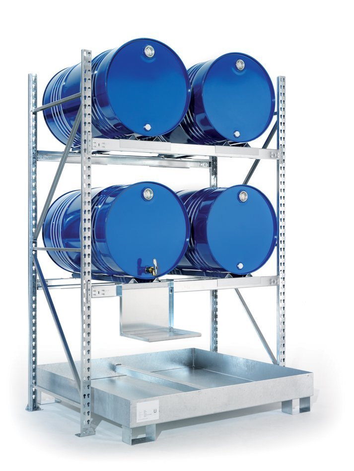 Regál na sudy základný. Výška 2200 mm x šírka 1400 mm x hĺbka 800 mm. Dve úrovne, prevedenie pozinok. Možnosť nastavovania prístavnými regálmi do požadovanej celkovej dĺžky.