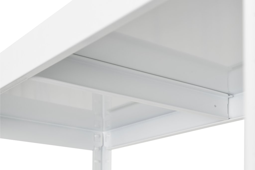 Univerzálny regál, bezskrutkový montážný systém, nosnosť police 130 kg. Výška regálu 1800 x šírka 600 x hĺbka 400 mm, 5x polica. Prevedenie biela farba.